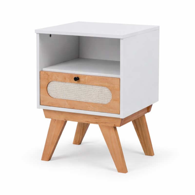 Produto é feito em madeira maciça de Pinus e MDF, possui gavetas com corrediças e puxadores metálicos e com detalhe em Rattan